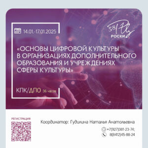 14.01.2025. Активные январские денечки, СТАРТ! #ДПО #Курсы #ЦифроваяКультура 🌀Повышаем квалификацию – “Основы цифровой культуры в организациях дополнительного образования и учреждениях сферы культуры”. Куратор – методист Наталья Гудилина 🌀Слушатели в гостеприимной Детская художественная школа № 3 г. Пензы Актуальные темы от Подробнее