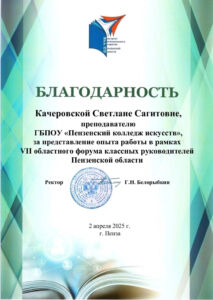 Преподаватель Пензенского колледжа искусств Качеровская Светлана Сагитовна приняла участие в VII Региональном форуме классных руководителей, который прошел 2 апреля 2025 года в Институте регионального развития.