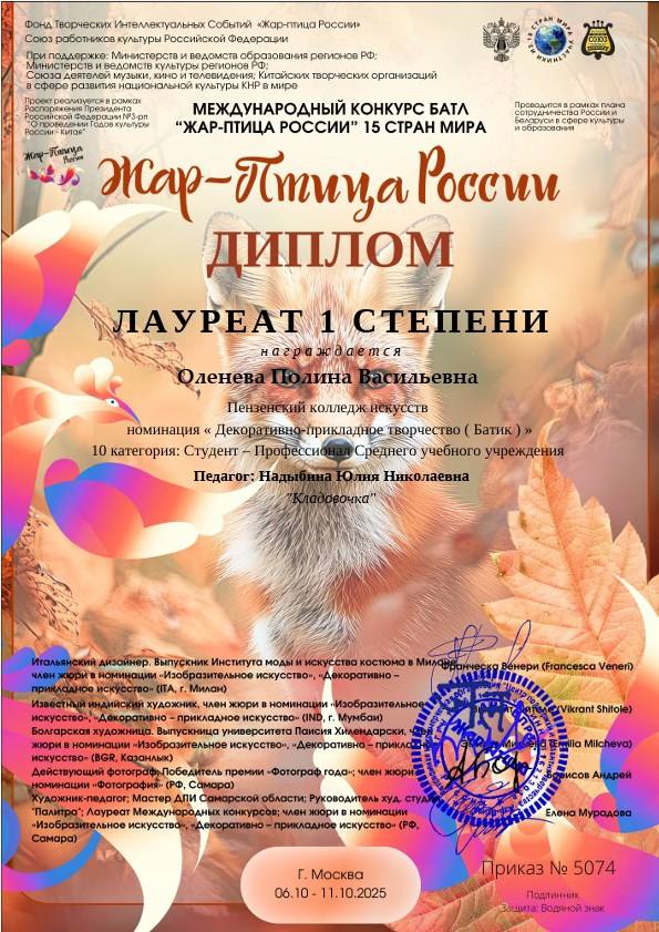 Гордимся нашей студенткой! Полина Оленева, учащаяся 4 курса по специальности «Декоративно-прикладное искусство и народное творчество», покорила жюри Международного конкурса «Жар-Птица России. 15 стран мира» и была удостоена высшей награды — звания Лауреата I степени в категории «Студент-профессионал».