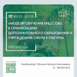 С 18 ноября начались курсы повышения квалификации по программе “Модели обучения лиц с ОВЗ в организациях дополнительного образования и учреждениях сферы культуры”. Первый день курсов прошел на базе ДМШ N 5 г.Пензы. В программе курсов: теория и практика, открытые показы, Подробнее