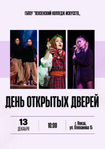 Уважаемые абитуриенты и родители! Государственное бюджетное профессиональное образовательное учреждение «Пензенский колледж искусств» приглашает вас на День открытых дверей, который состоится 13 декабря в 10:00. В программе мероприятия: · Знакомство с руководством и преподавателями колледжа. · Презентация специальностей и направлений Подробнее