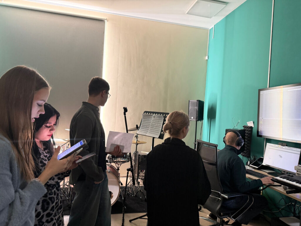 Сегодня на профессиональной студии звукозаписи состоялся первый этап творческой работы: обучающиеся колледжа приступили к записи песни.